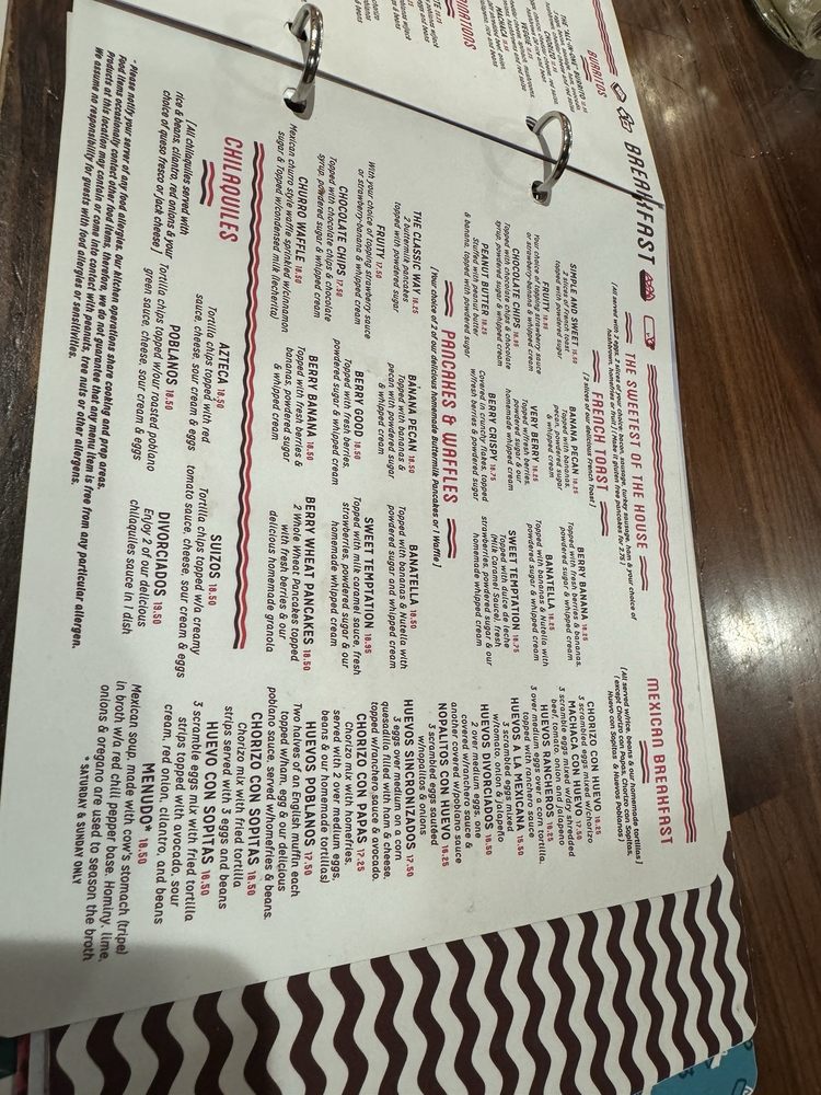CHORIZO MIXED WITH HOMEFRIES , 2 EGGS ANY STYLE, CHILAQUILES POBLANOS WITH JACK CHEESE & SOUR CREAM AND BEANS