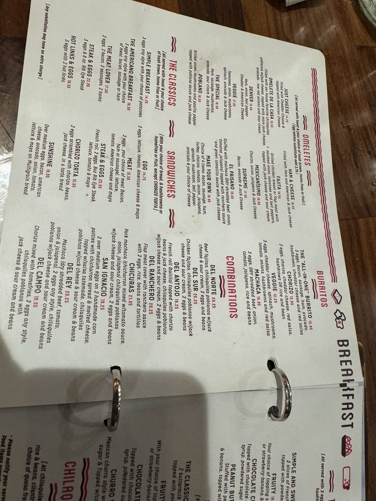 3 eggs, chorizo, cheese, salsa, hash brown or rice and beans.